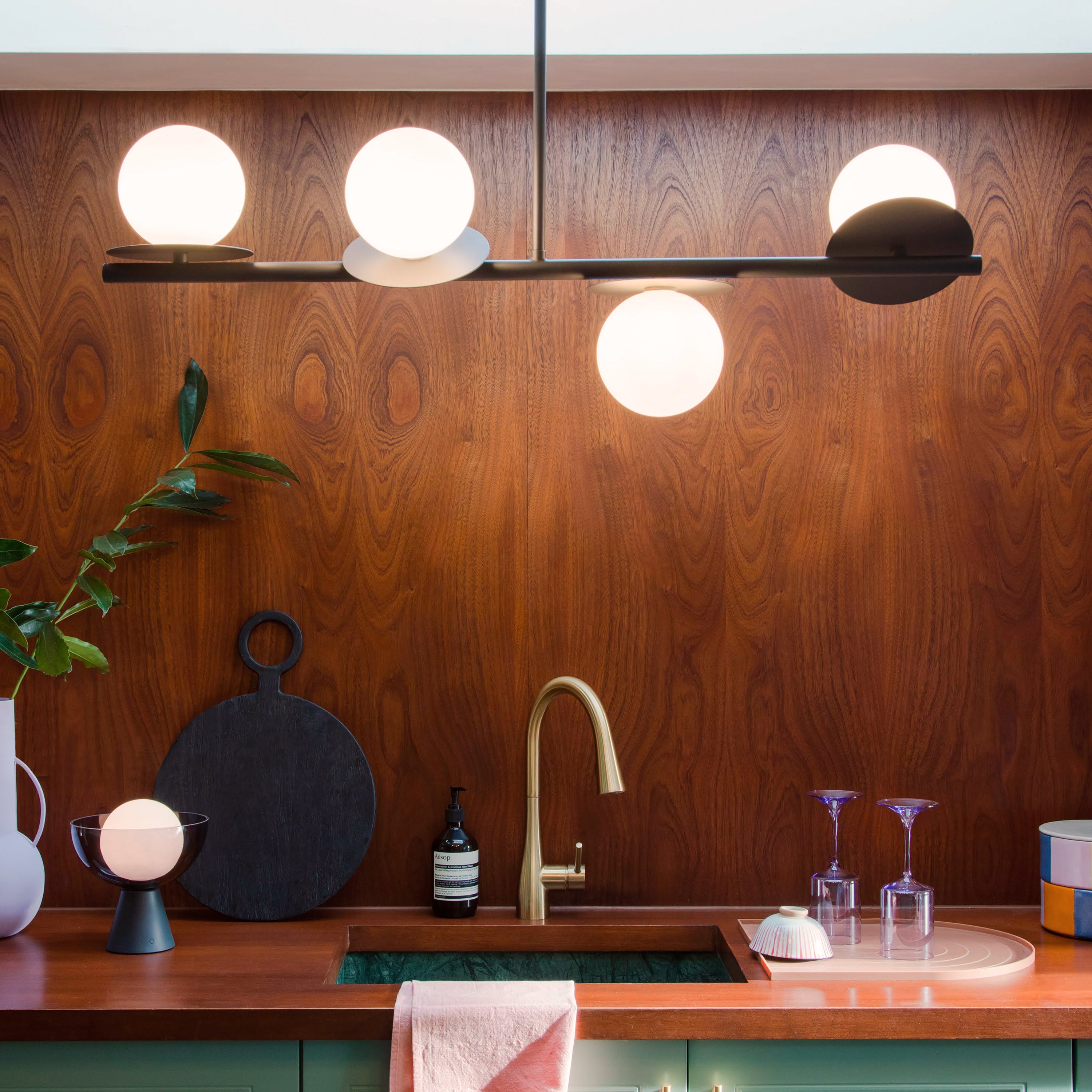Thoughtfully engineered for humid environments (IP44 rated), it’s as purposeful as it is poetic. With adjustable drop-length for low or vaulted ceilings and dimmable G9 bulbs, this piece functions with the same grace it exudes visually. In polished brass, it becomes a warm statement of balance, drawing attention while enhancing the glow.