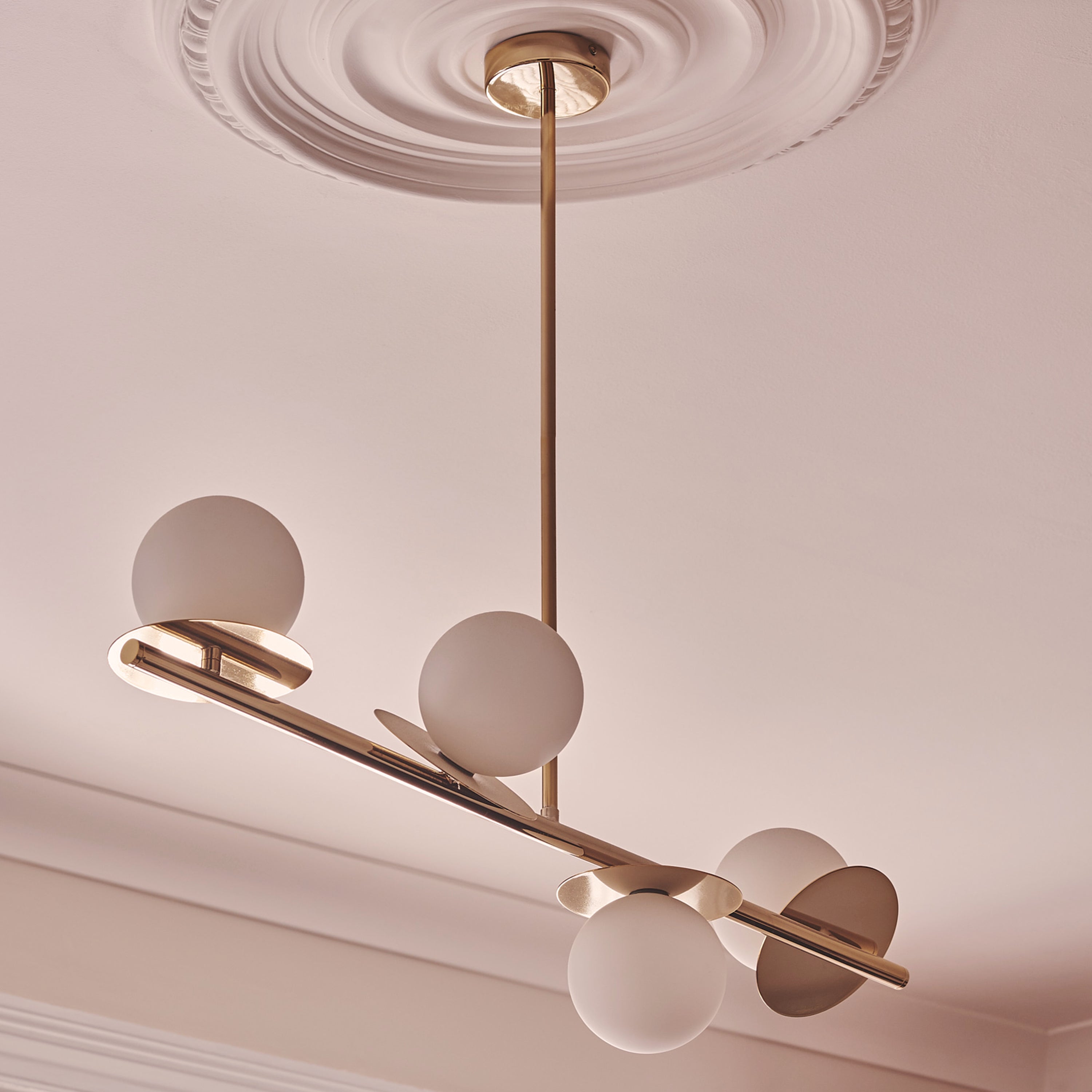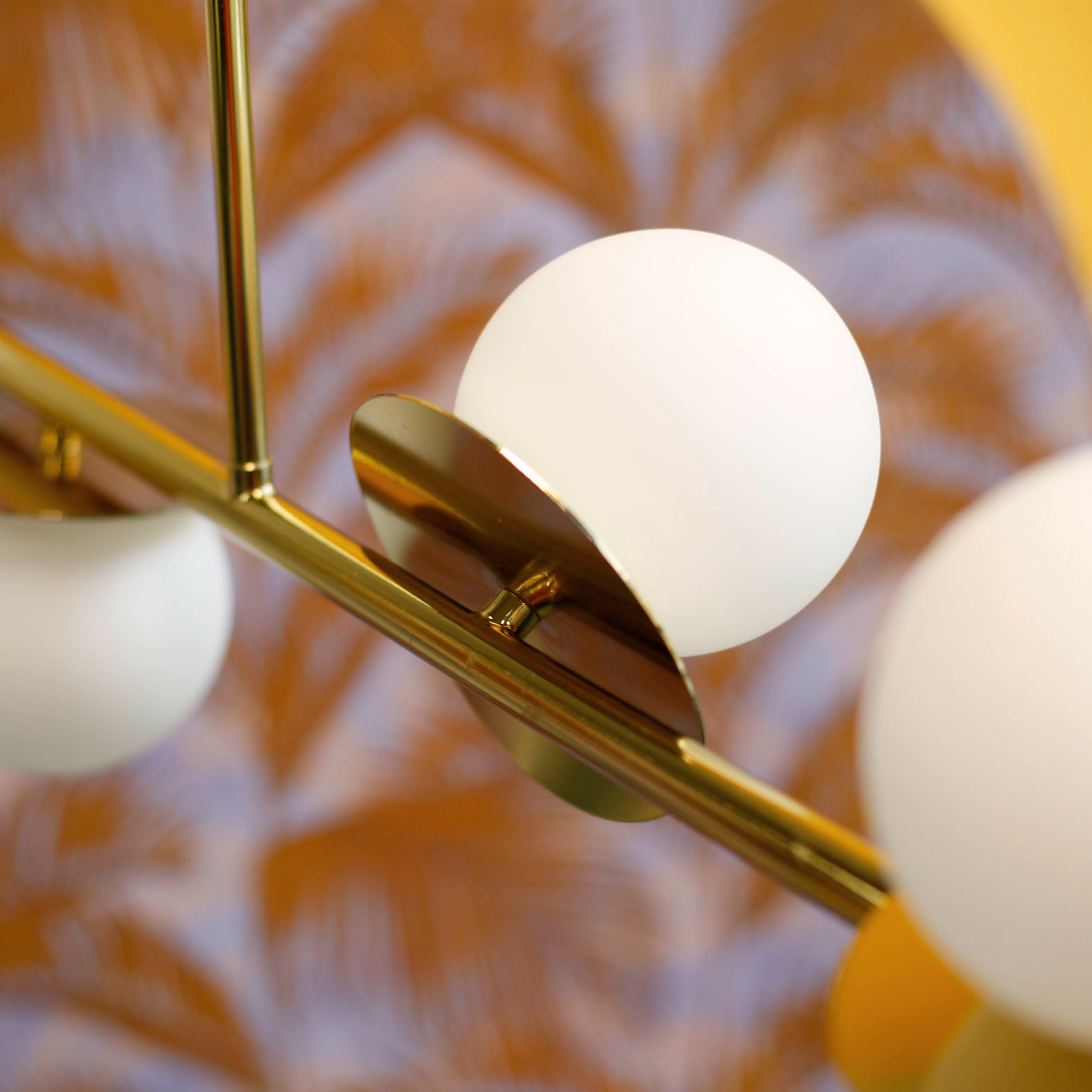 Plated steel frame (brass finish), hand-blown opal glass shades, hardwired metal rose, G9 fittings, cotton-wrapped cable