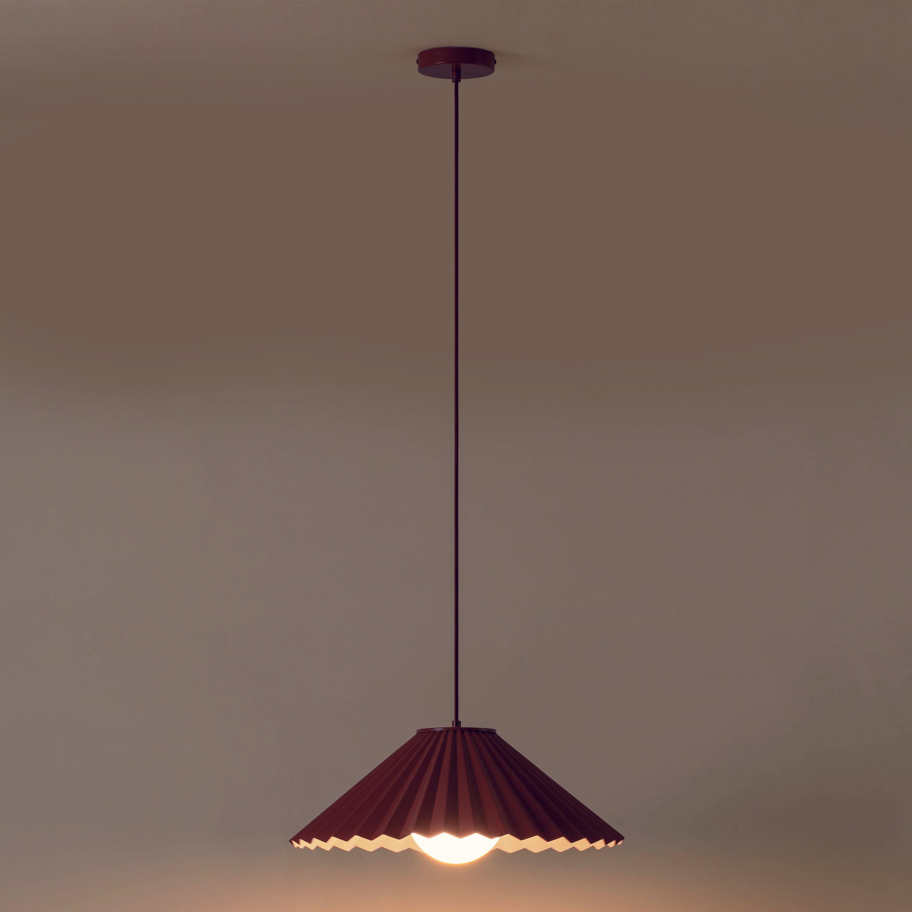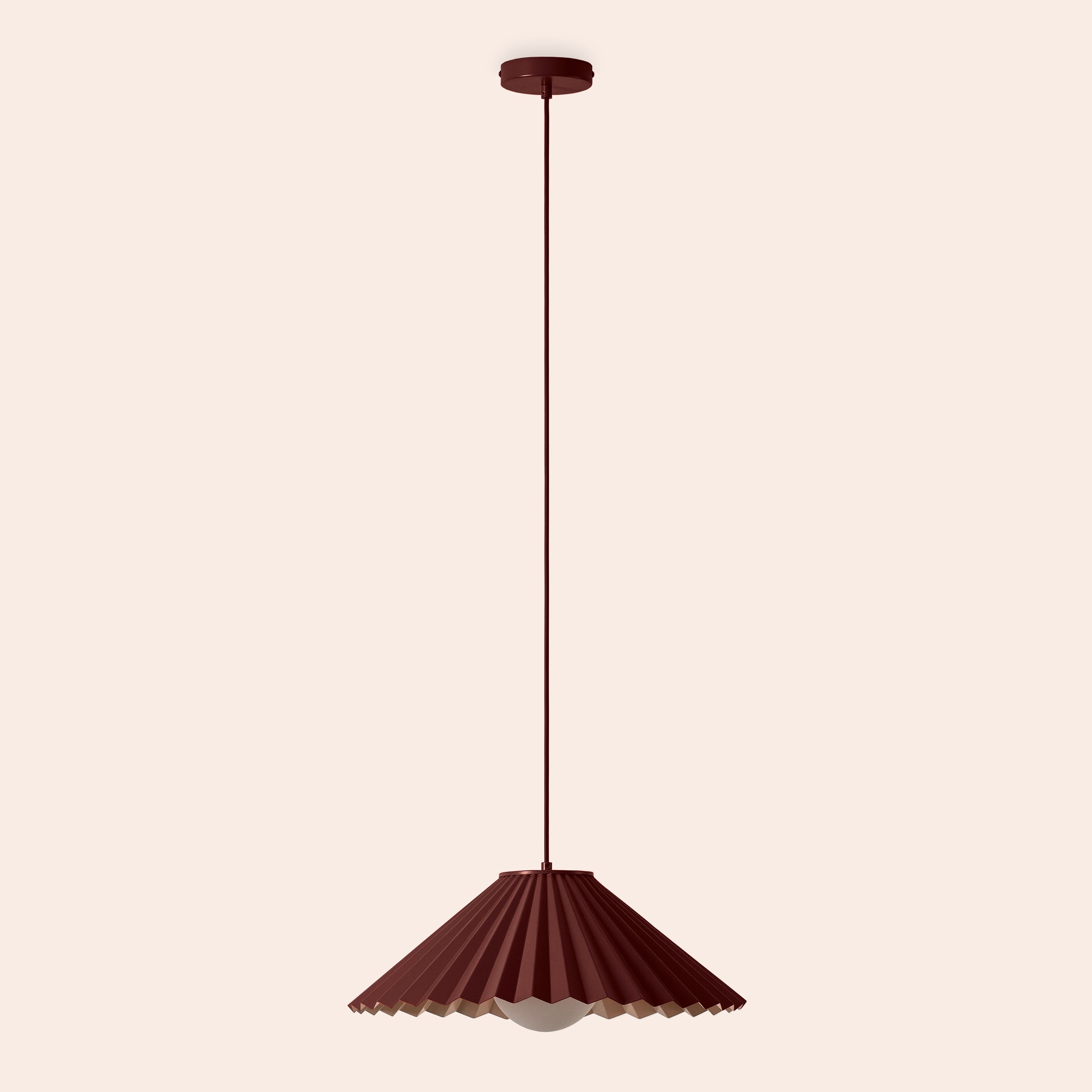 Powder‑coated steel body, pleated glass shade, cotton-covered cable in matching burgundy