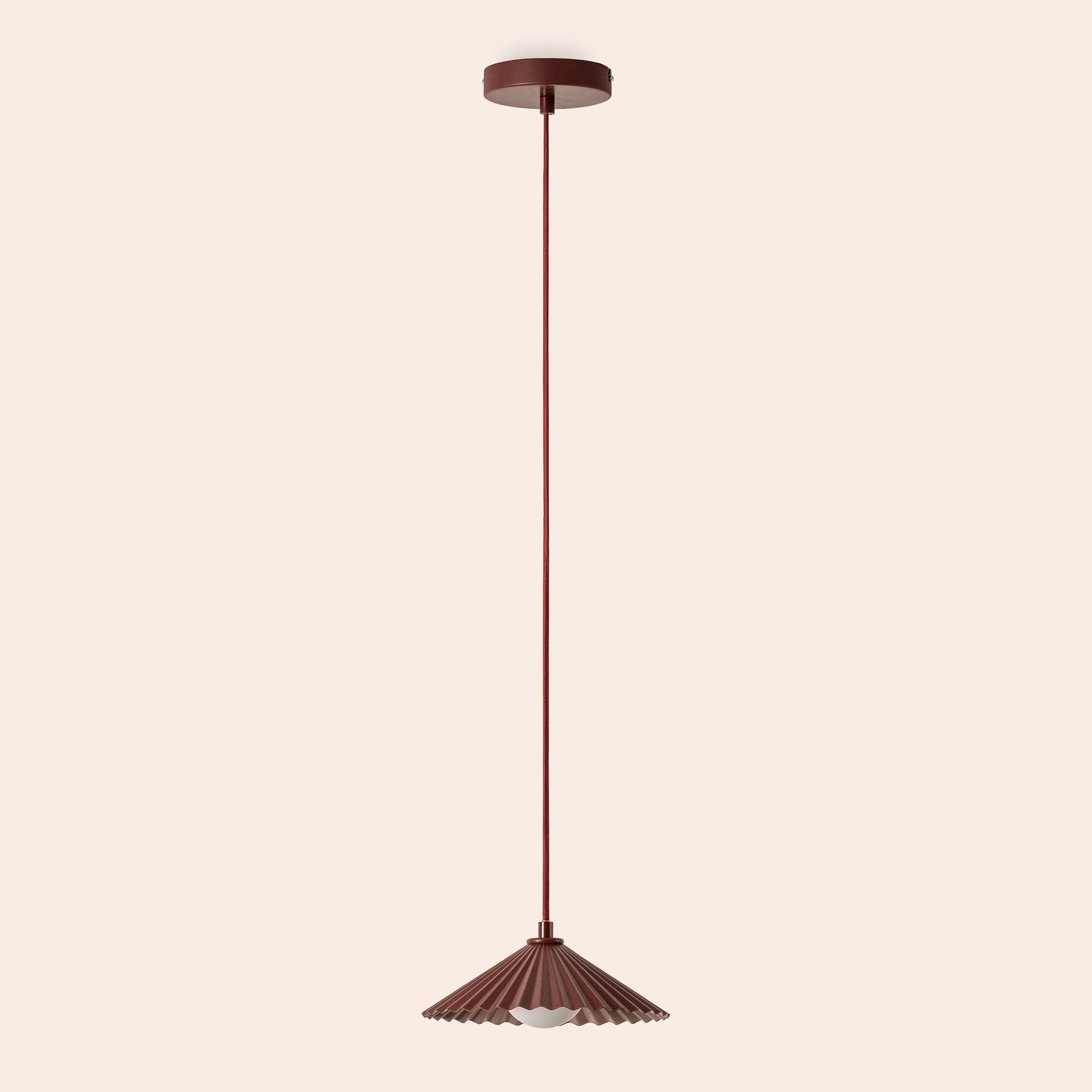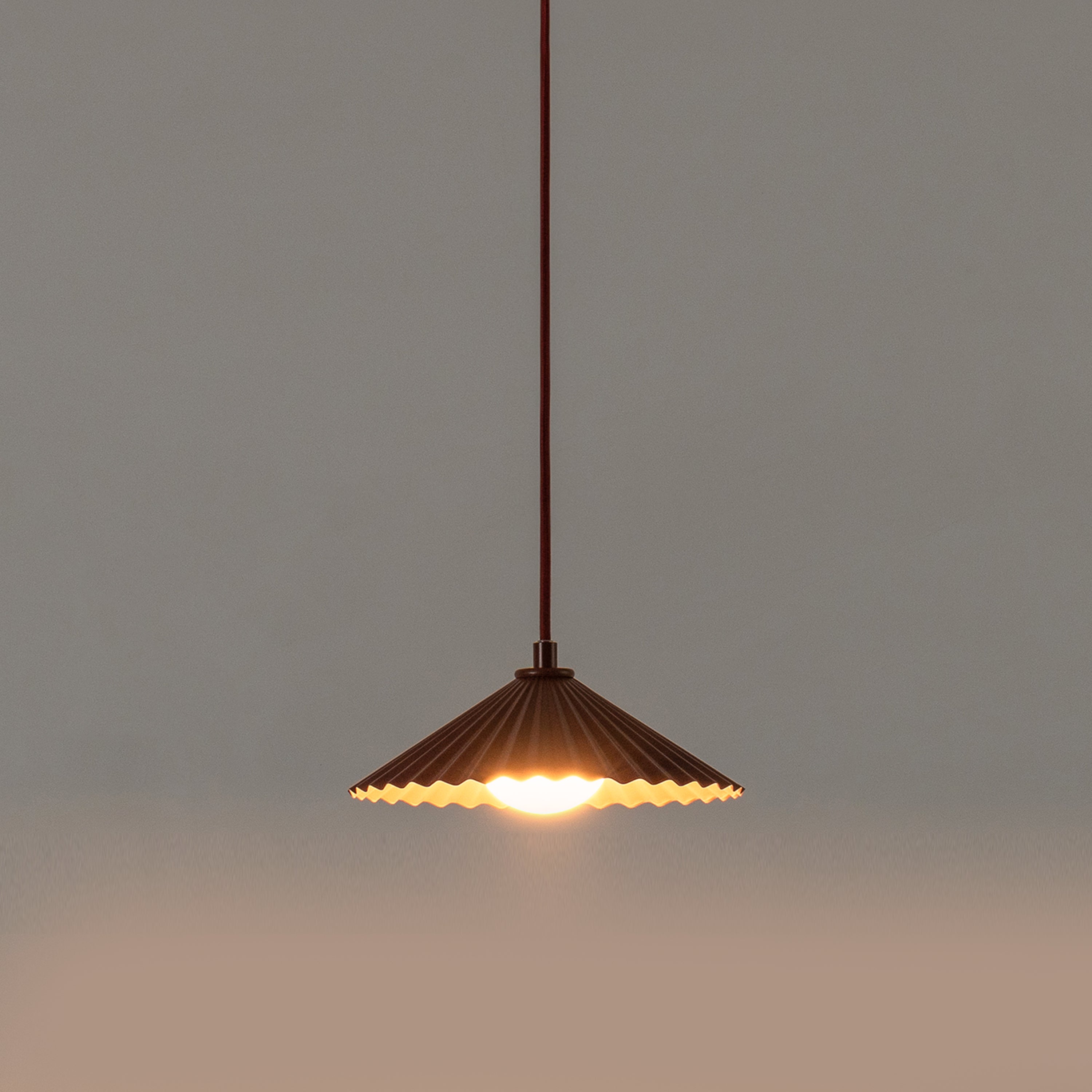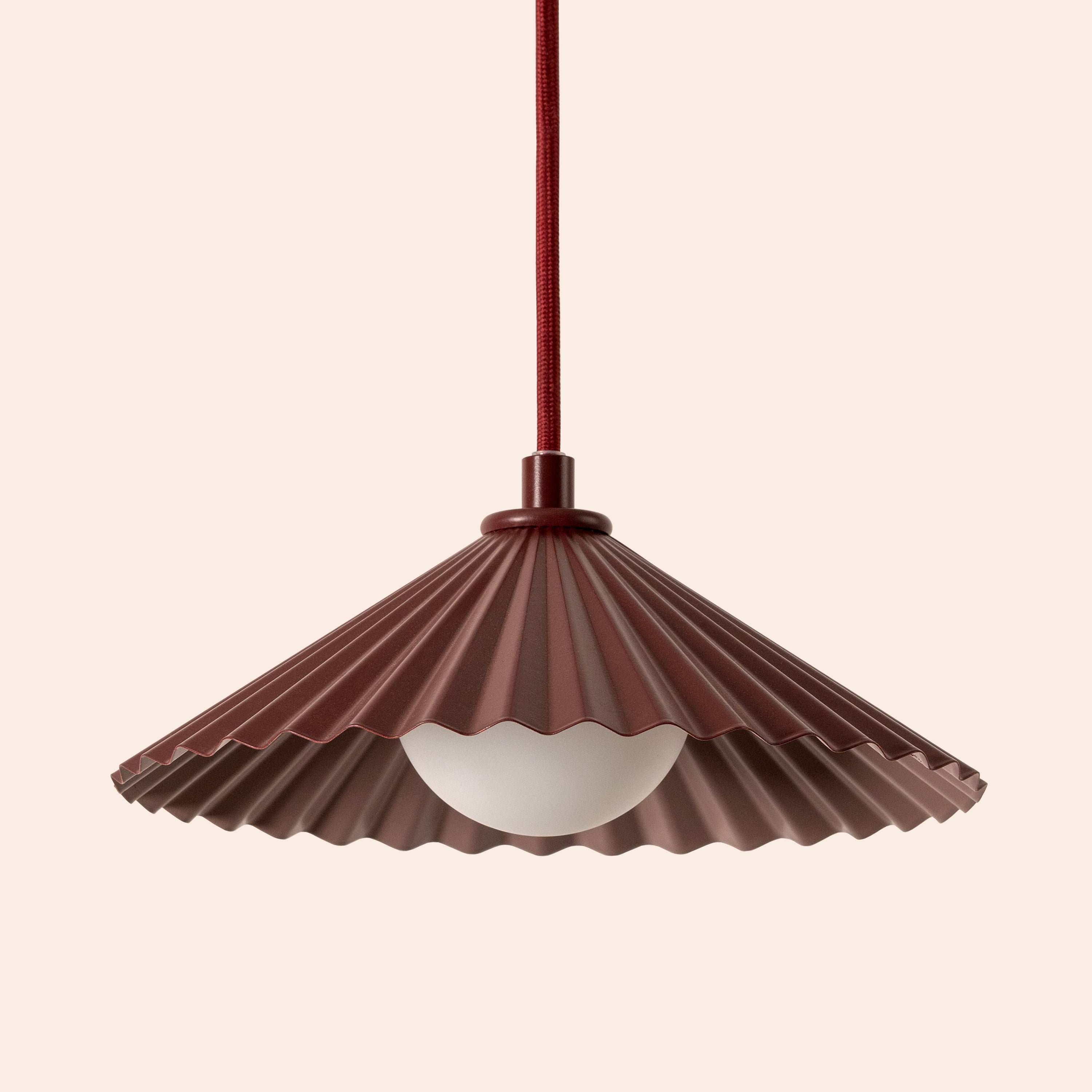 The Burgundy Small Pleat Pendant is a compact masterpiece—deep burgundy on the outside with a soft lilac interior, this petite shade diffuses a warm glow that instantly uplifts smaller spaces. Designed by Emma Gurner, its pleated steel form references vintage fabric lampshades reimagined through a modern lens.