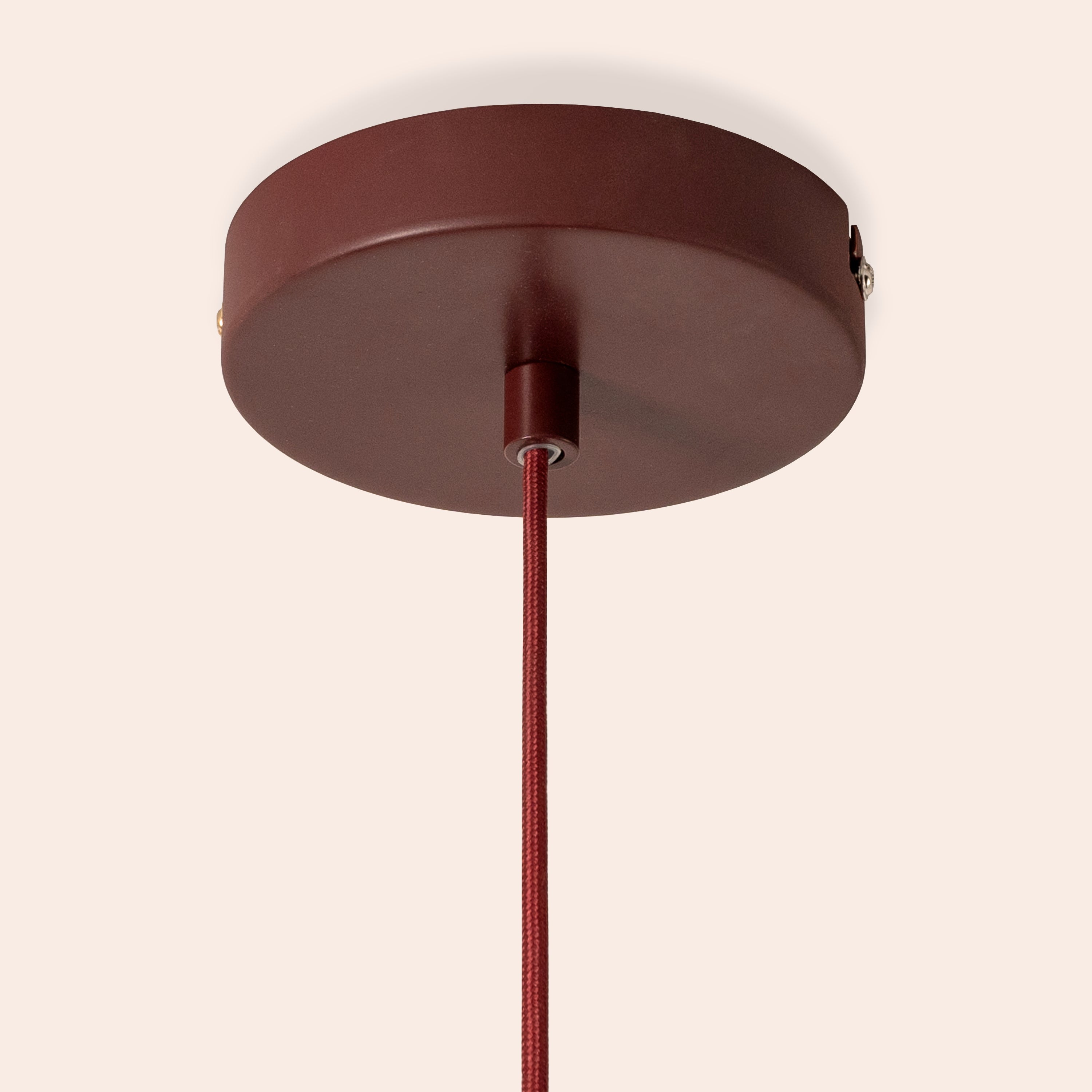 Powder‑coated steel (burgundy exterior, lilac interior), glass pleated shade, cotton-wrapped burgundy cable