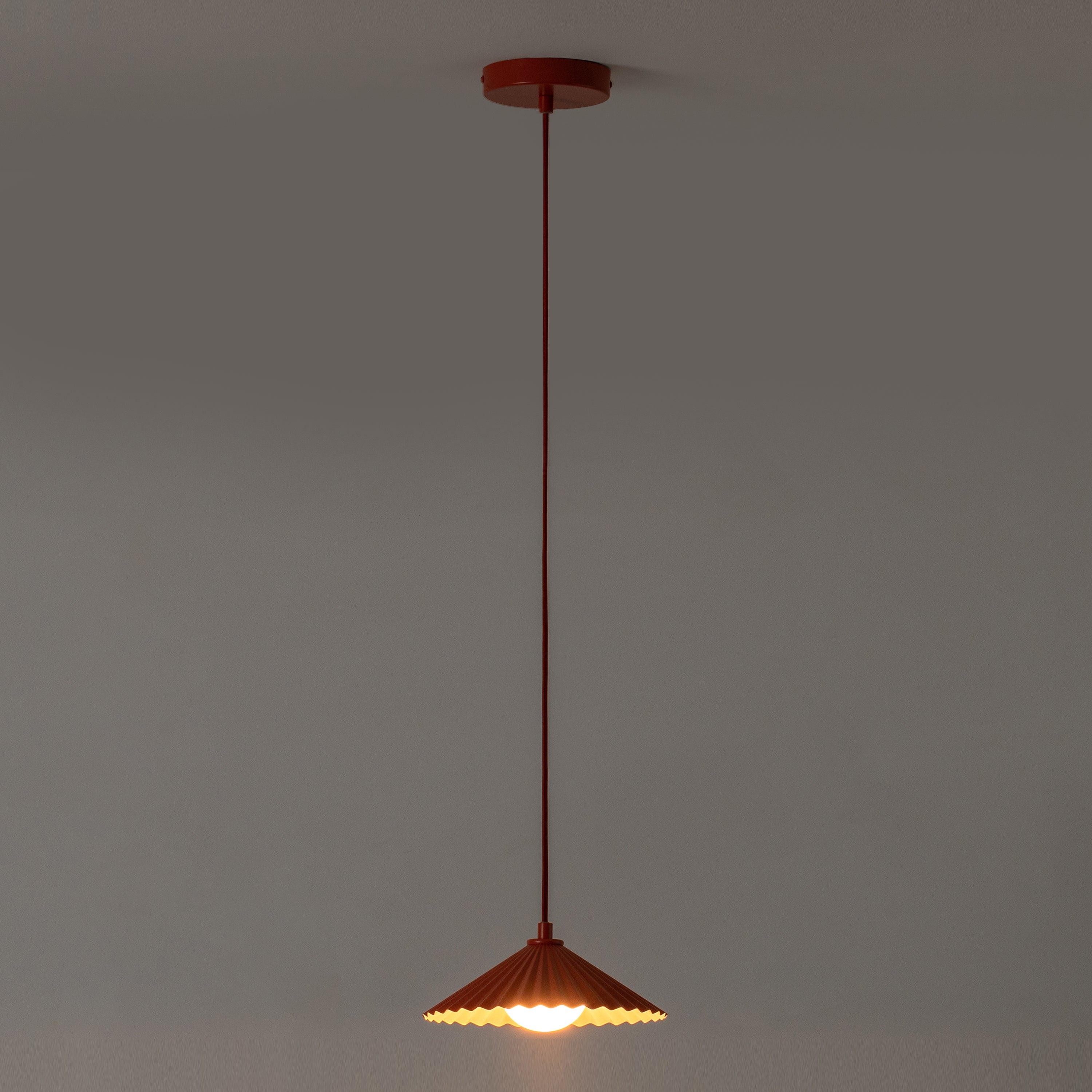 Compact meets sculptural in the Burnt Orange Small Pleat Pendant, designed by Emma Gurner in collaboration with houseof. This petite pleated shade—painted rich burnt orange on the outside and soft peach on the inside—casts a warm, ambient glow that elevates kitchens, counters, or intimate dining corners with unapologetic personality. Despite its compact size, the shade retains tactile form and presence, bringing texture, depth, and elevated detail to layered lighting schemes.