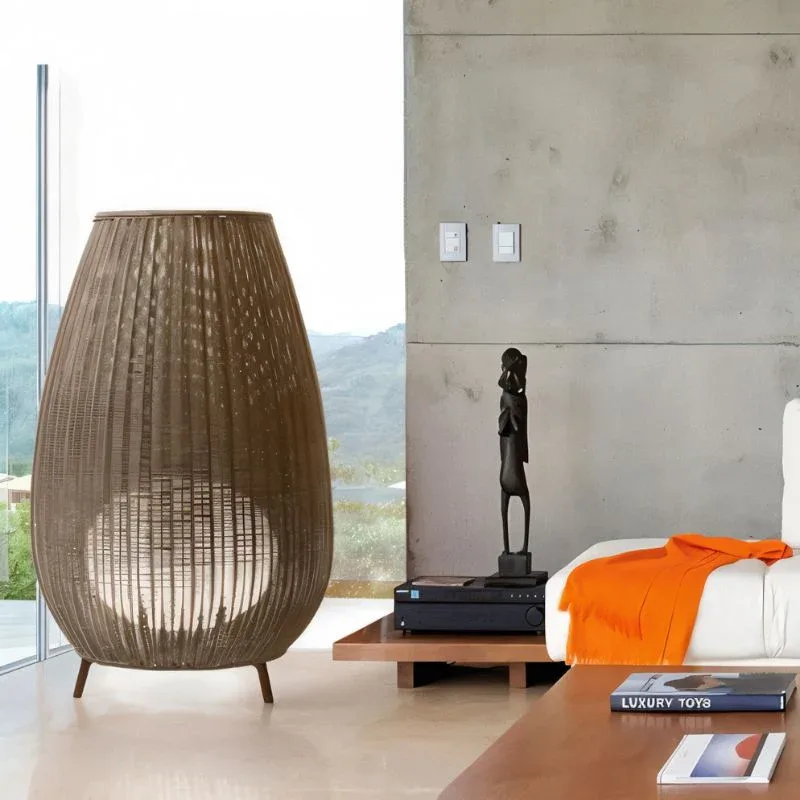 Candice Outdoor Floor Lamp — Hand-Woven Rattan Lantern with Ambient LED Glow