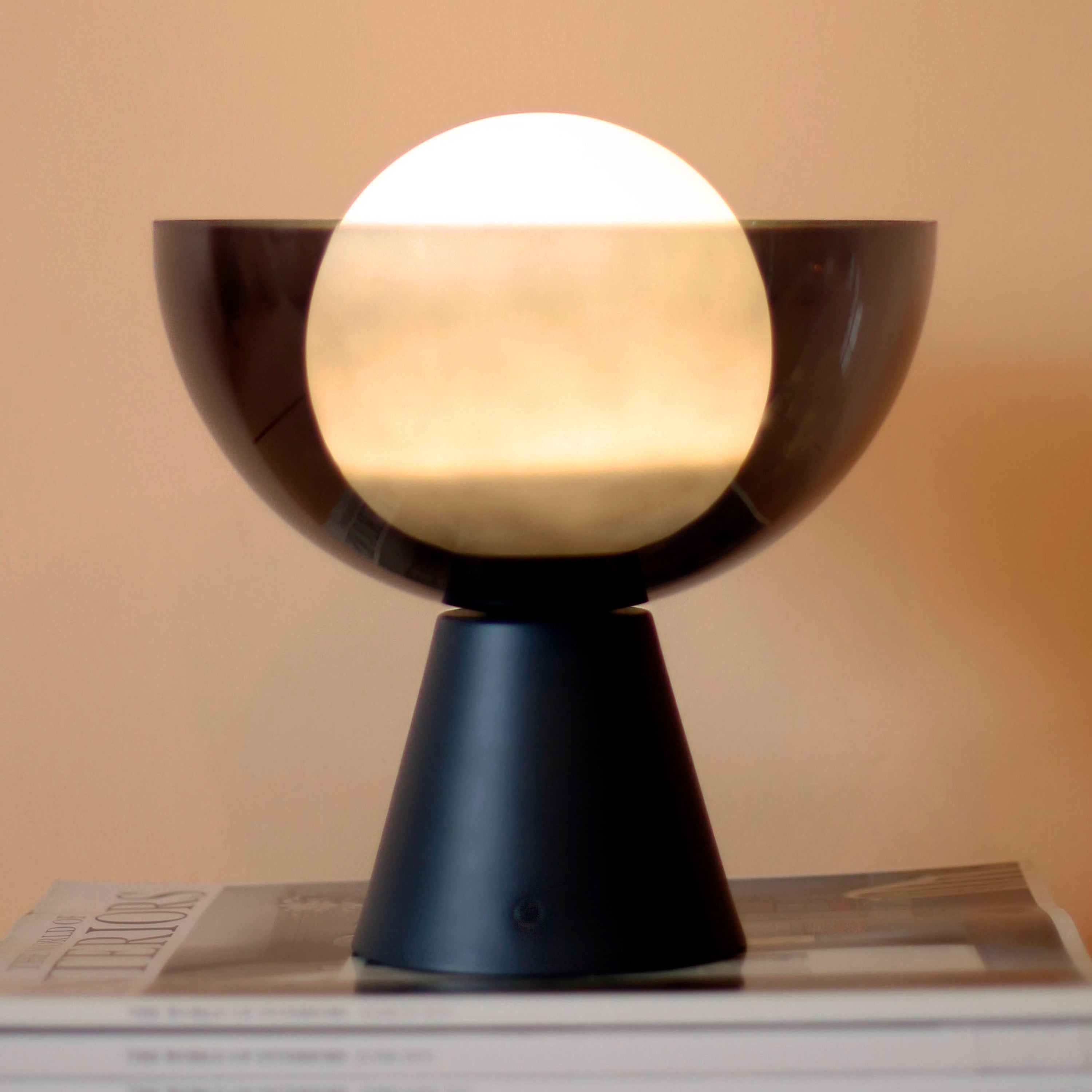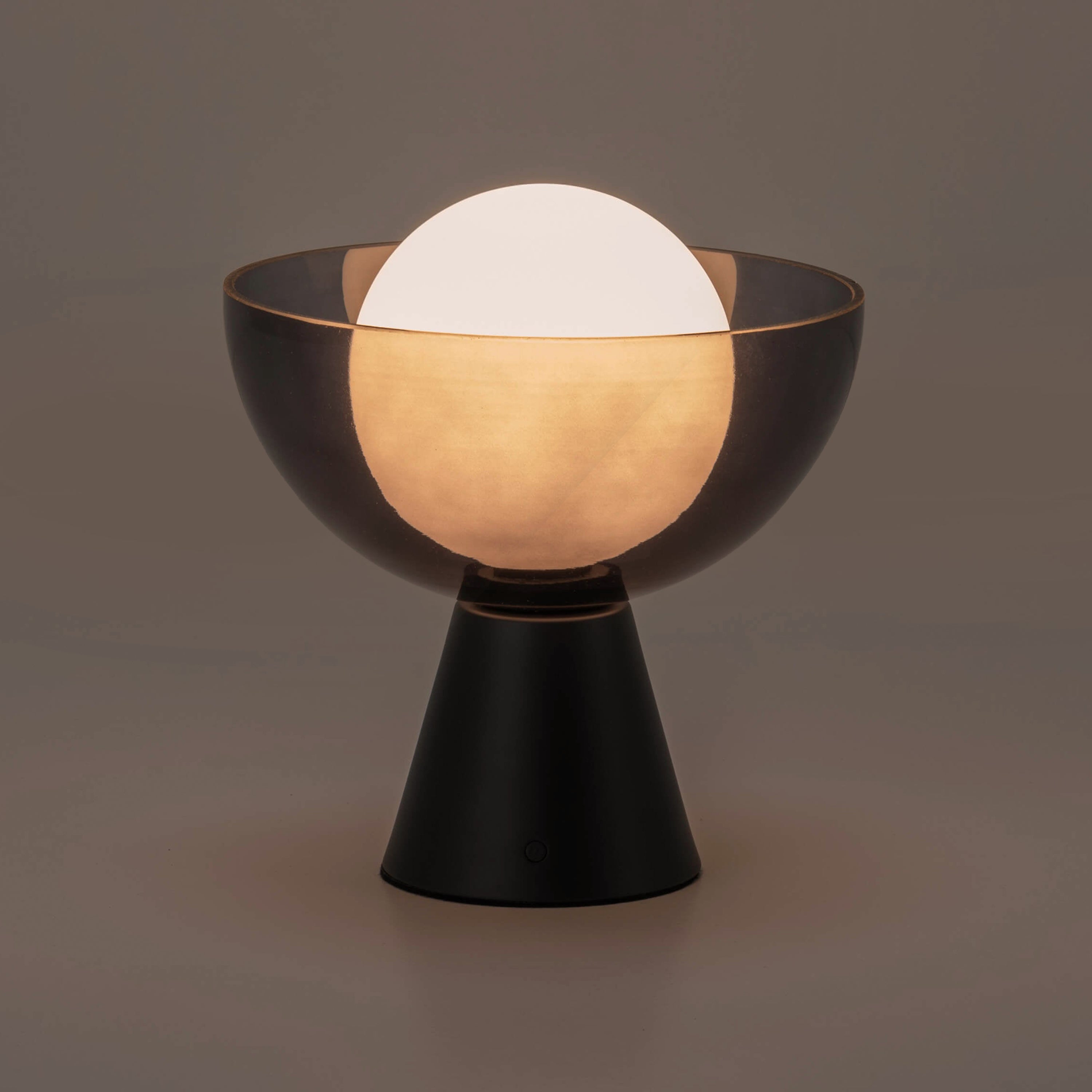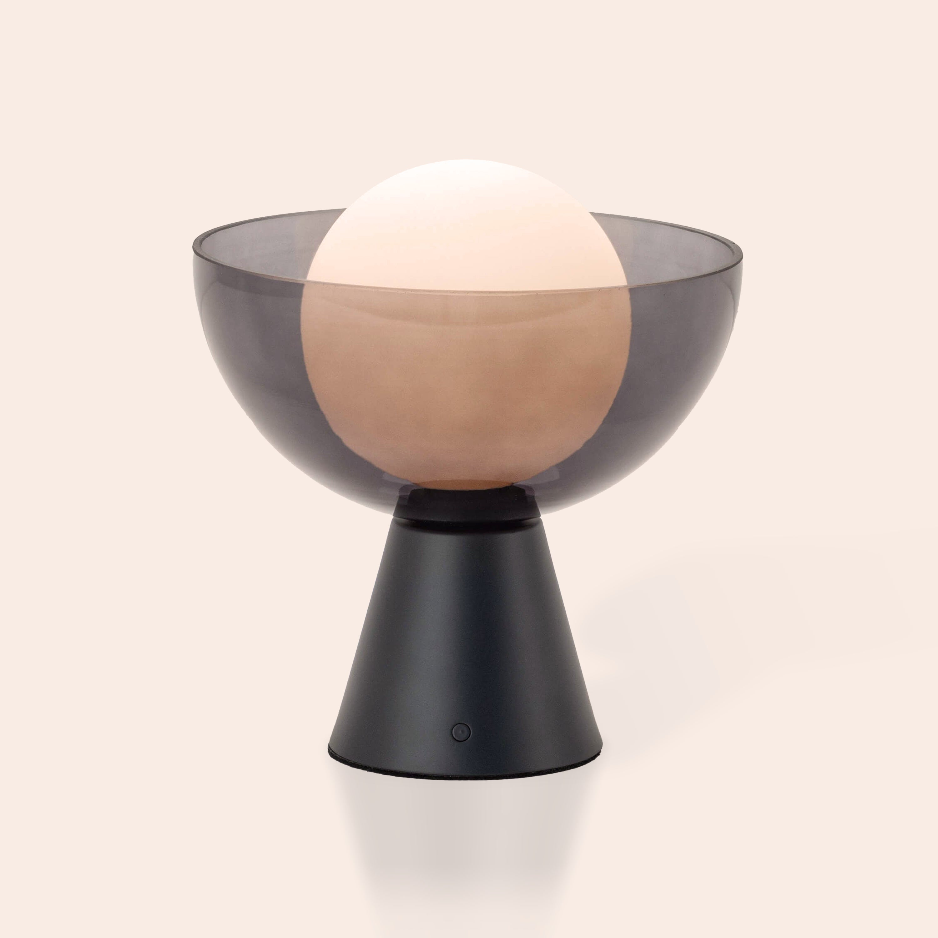 The Charcoal Grey Dome Cordless Table Lamp is a mood-setting minimalist designed to move with your life. With a smoked-glass bowl encasing an opal glass diffuser, it evokes the soft glow of the moon—perfect for bedside styling, coffee tables, or shelf installations. Totally wireless, it runs on rechargeable internal battery and features a discreet body switch with multi-step touch dimming. Ideal for intuitive, portable ambience in curated interiors.