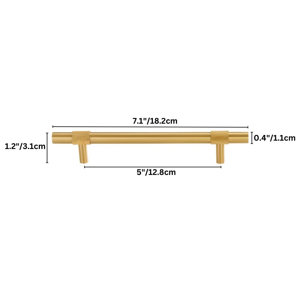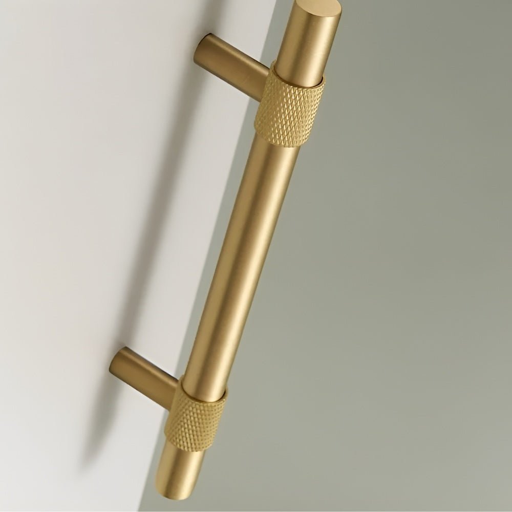 The Grist Knob And Pull Bar is a modern brass handle with a brushed gold finish and black knurled accents for an industrial touch. Its sleek cylindrical design offers a secure grip, making it ideal for cabinets, drawers, wardrobes, and furniture in contemporary spaces. Durable and stylish, it suits both residential and commercial use.