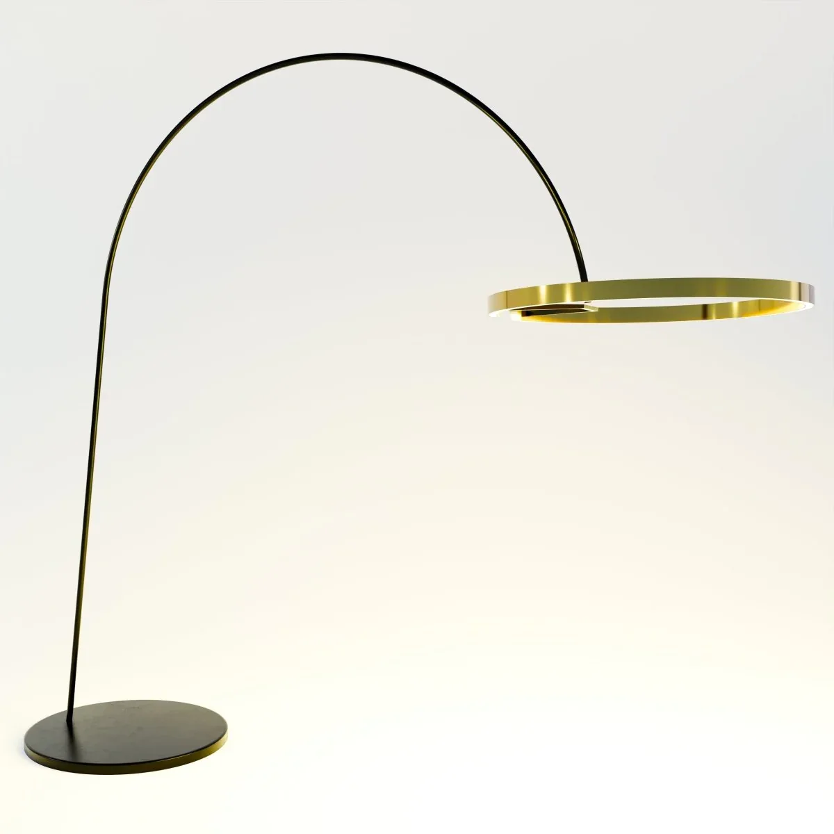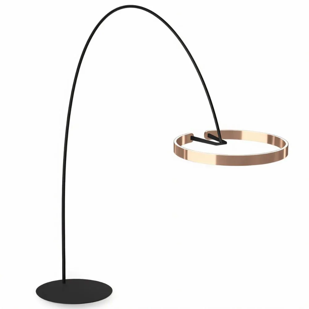 The Halo Floor Lamp features a striking design with a curved arm and two concentric rings, creating a dramatic and modern aesthetic. The light fixture is crafted from a combination of acrylic and aluminum, offering a blend of elegance and durability. It is perfect for illuminating living rooms and lounge areas adding a touch of sophistication to any contemporary space.