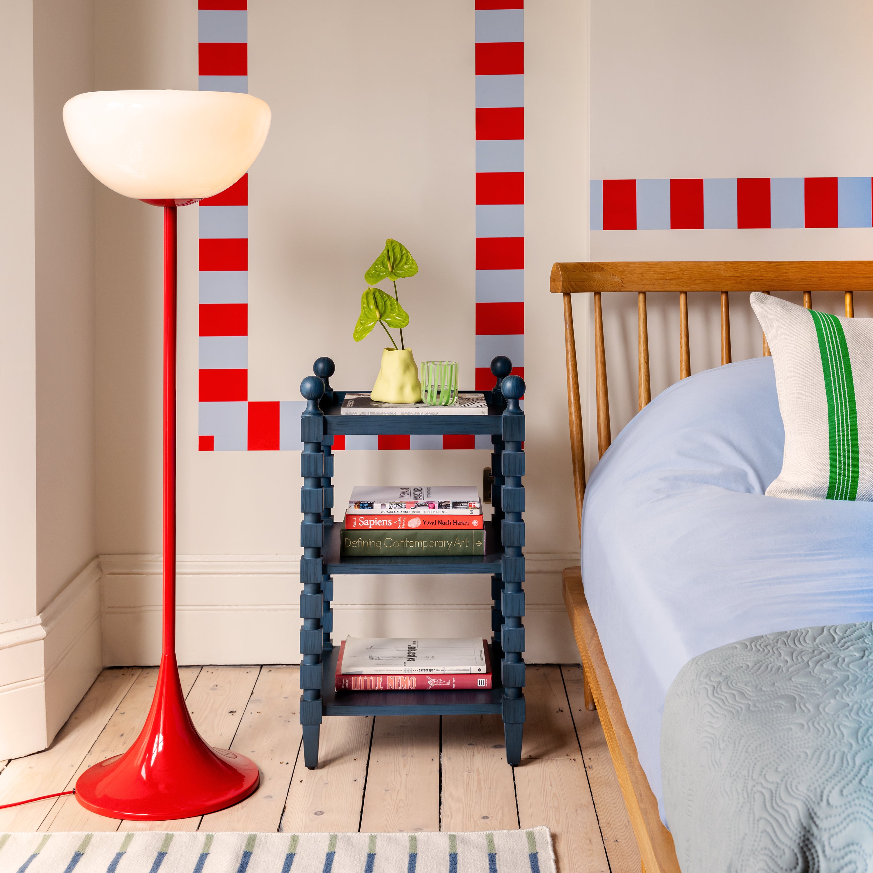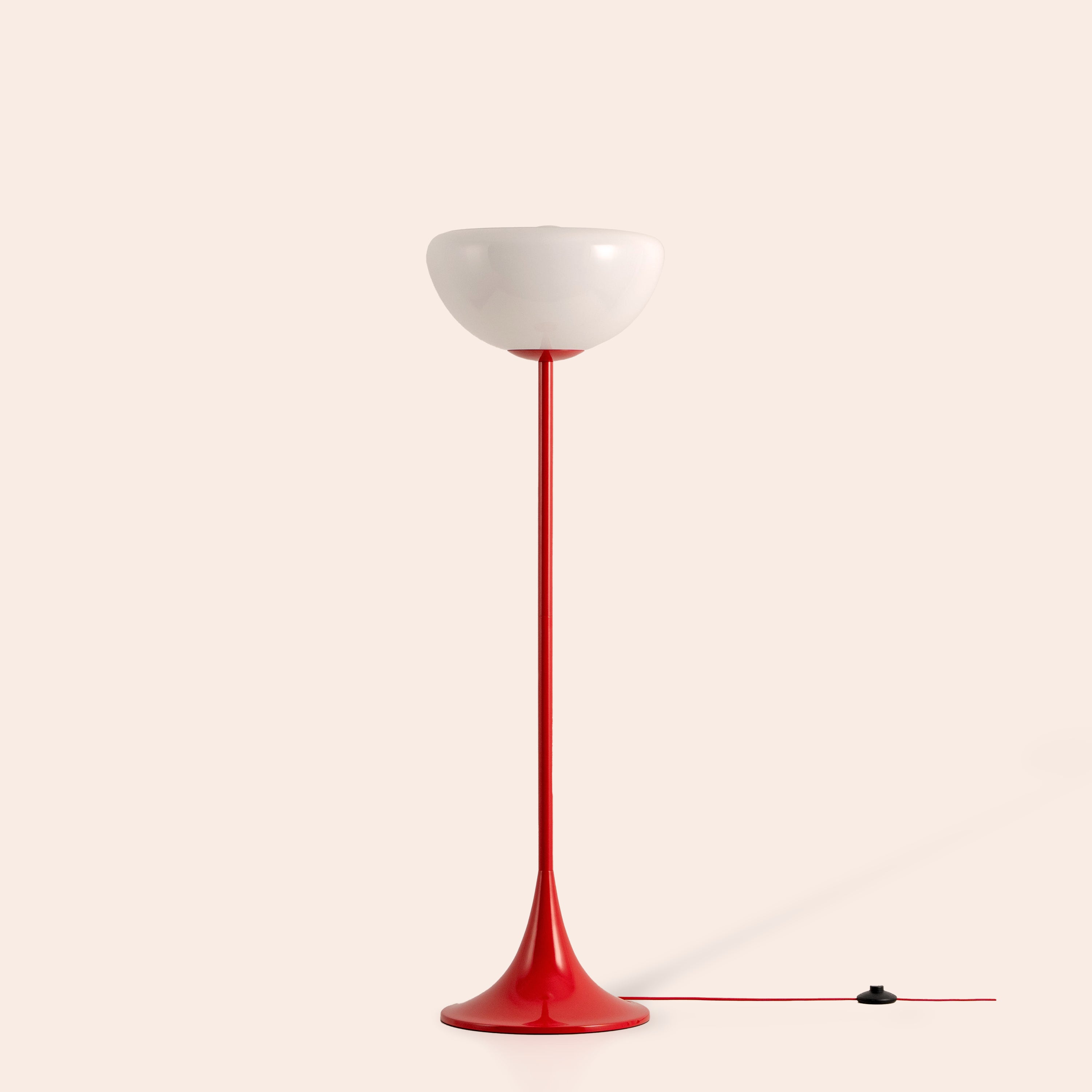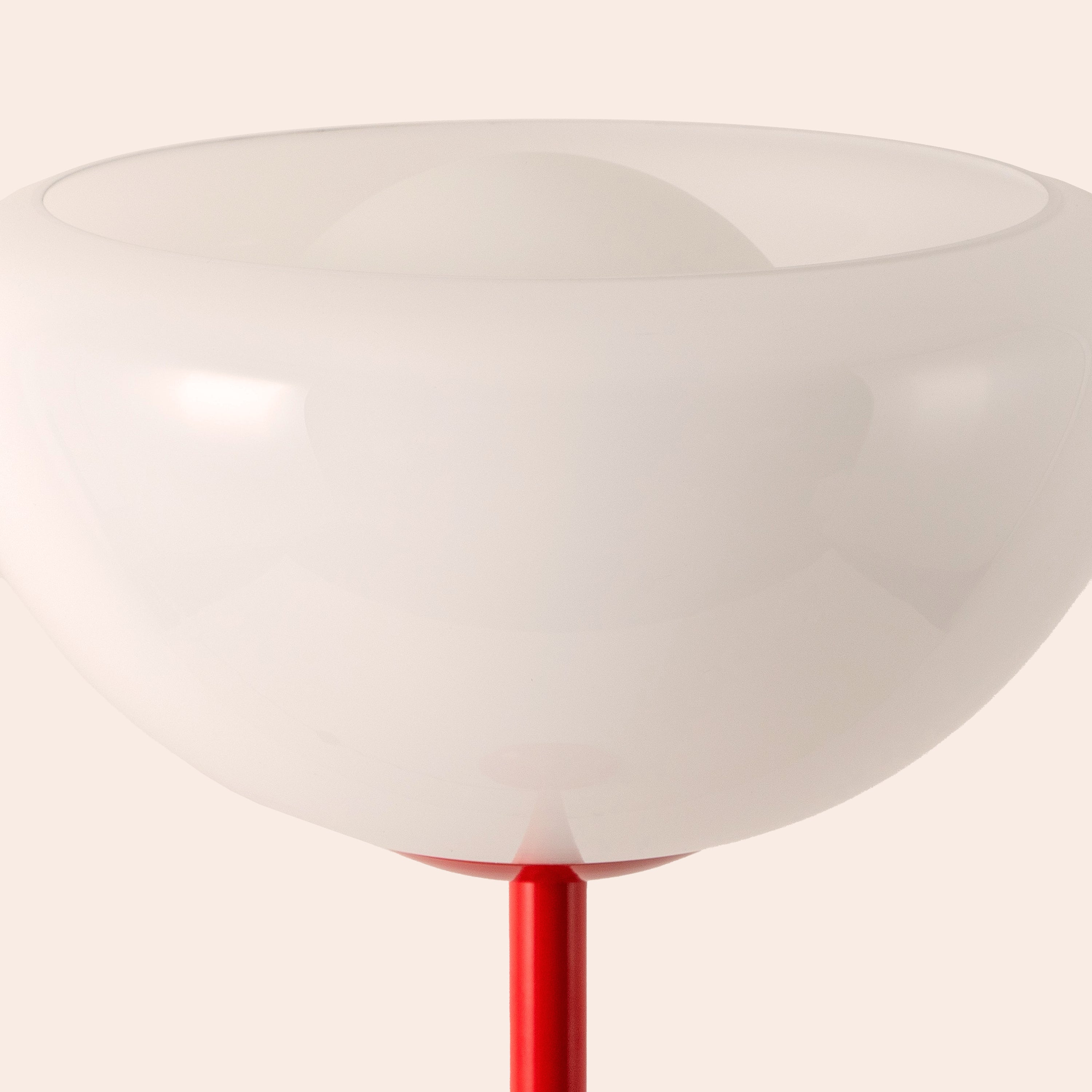 Channel ’80s optimism with the Jam Red Glass Bowl Floor Lamp—a bold presence with nostalgic soul. Its glossy lacquered red metal base supports a thick opal-glass bowl diffuser, casting warm, all-room glow that feels dramatic yet inviting. Oversized curves and high gloss finish evoke Memphis design classics, while the soft ambient output keeps it grounded in modern calm. This lamp isn’t just lighting—it’s a mood-maker, perfect for lounge corners, bedrooms, or creating intentional calm in living spaces. It’s emotionally vivid lighting with real design depth.