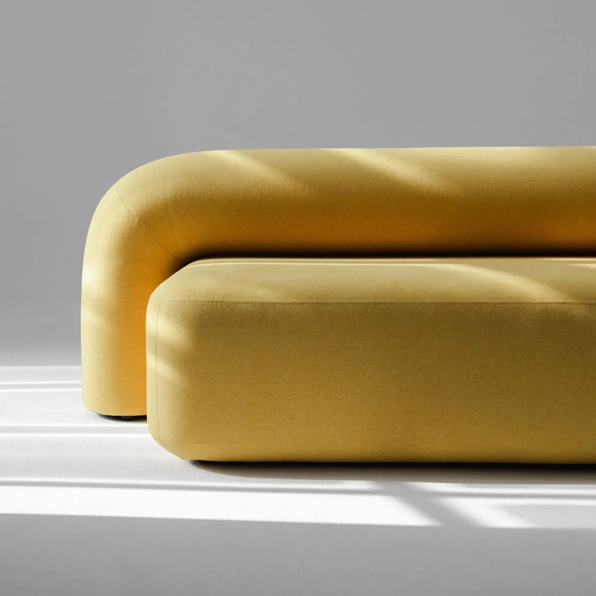 Upholstered in textile and built on a solid wood frame, the sofa offers ergonomic seating with a lower profile and supportive depth. Made-to-order with fabric customization options, it suits curator interiors and boutique spaces.