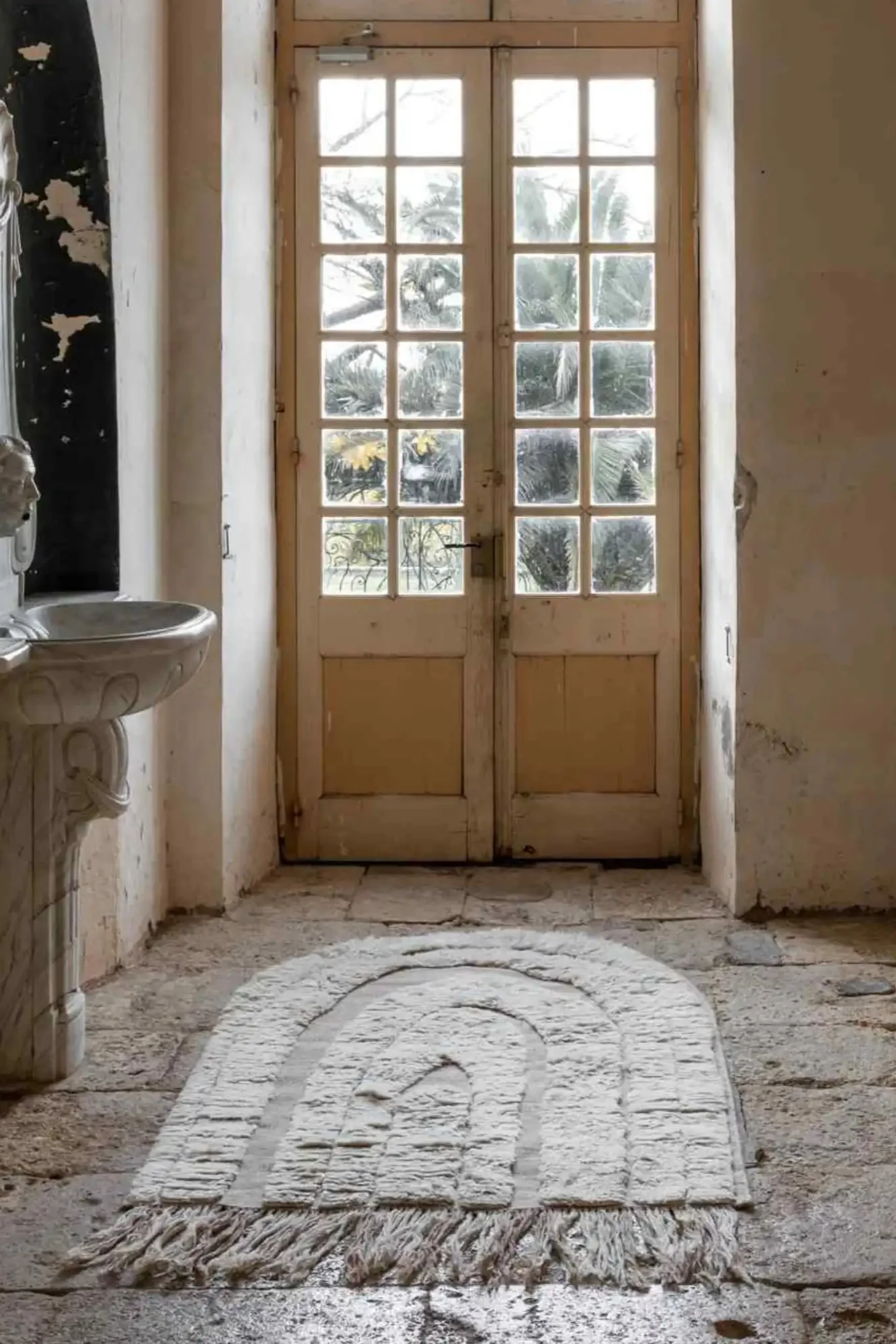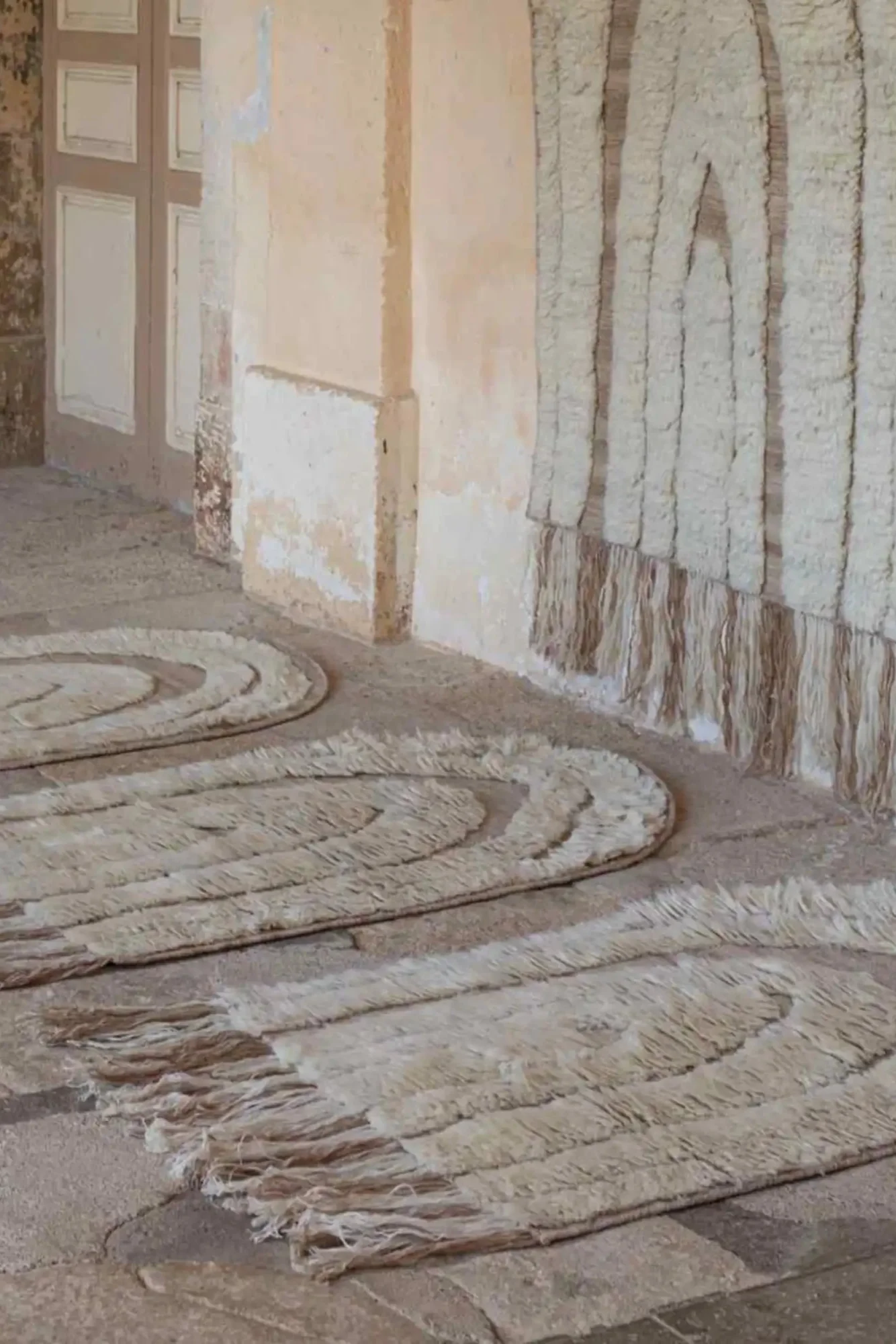 Celebrating artisanal individuality, each piece is unique—variations in color, shape, and texture reflect the hand-crafted process. Whether draped on a wall as an artful focal point or layered on the floor for luxe texture, this rug creates a relaxed yet elevated presence within both modern and refined interiors.