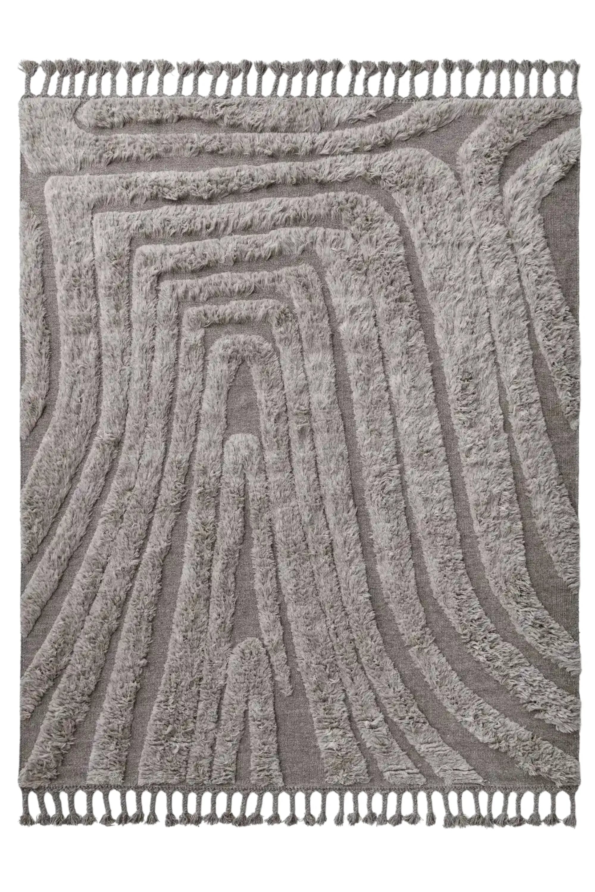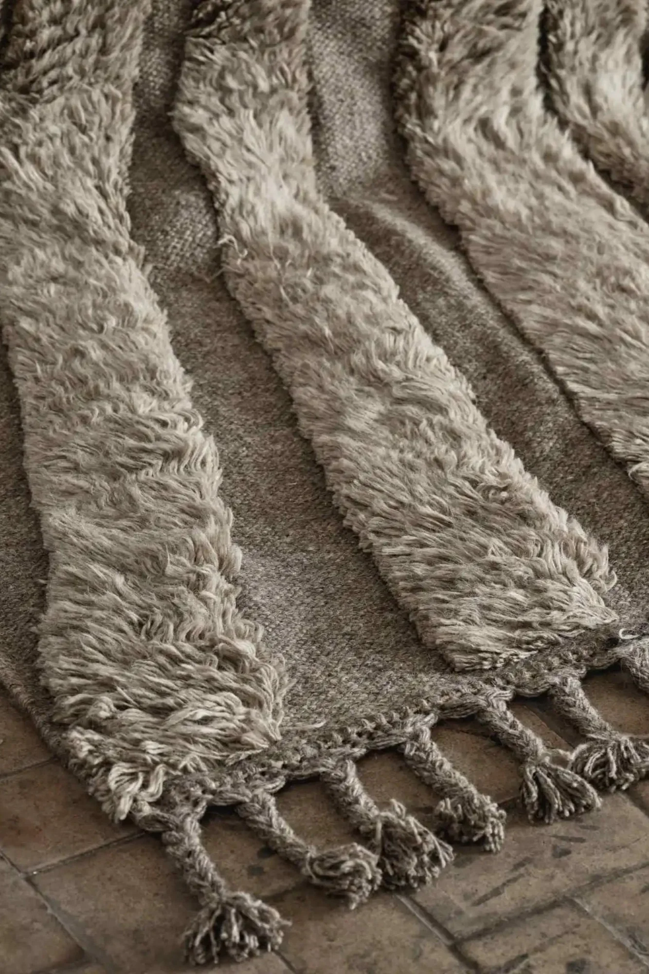 The extended fringe detail introduces effortless movement and artisanal charm, while subtle tonal variations celebrate the handcrafted nature of each piece. Whether anchoring a living area, framing a seating group, or creating a sculptural statement in a bedroom, this rug adds timeless natural warmth and personality to contemporary or classic spaces.