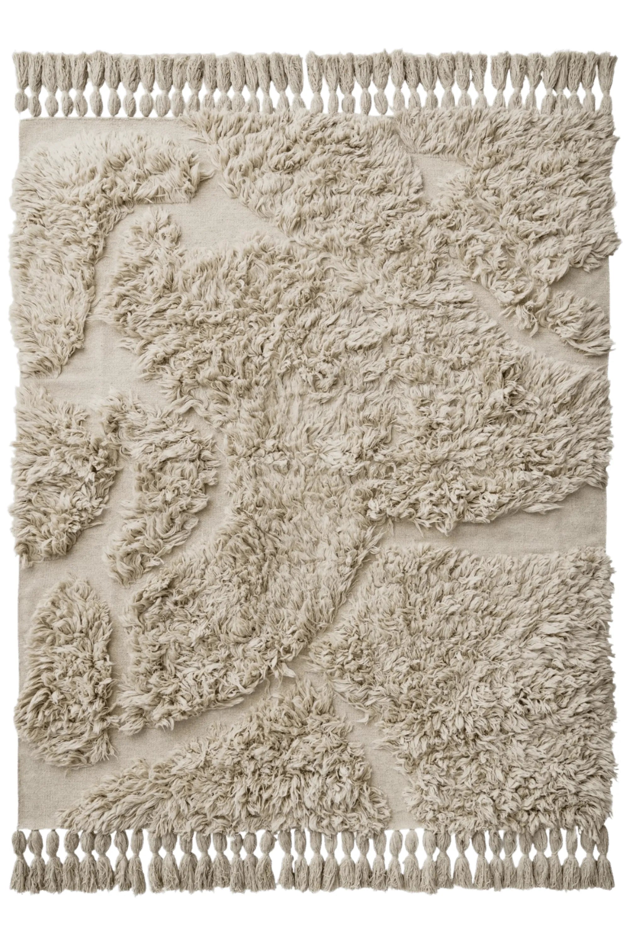 Rug No. 07 embodies understated bohemian elegance through its freeform texture and artisanal detailing. Crafted from natural unbleached New Zealand wool, the rug features a subtle play of highs and lows across its surface, creating visual depth and inviting tactility. The soft cream-beige hue lends calm sophistication, while chunky tassels along the edges introduce a playful, handcrafted flourish.
