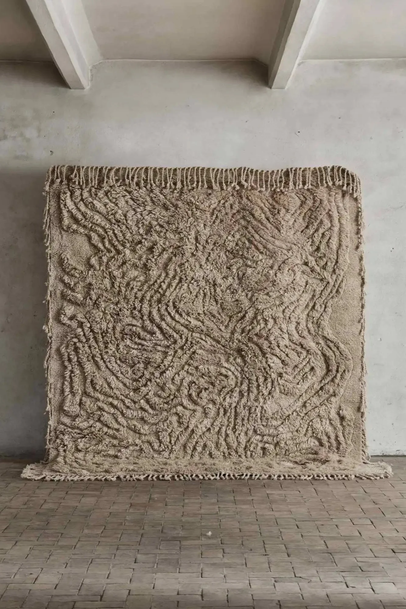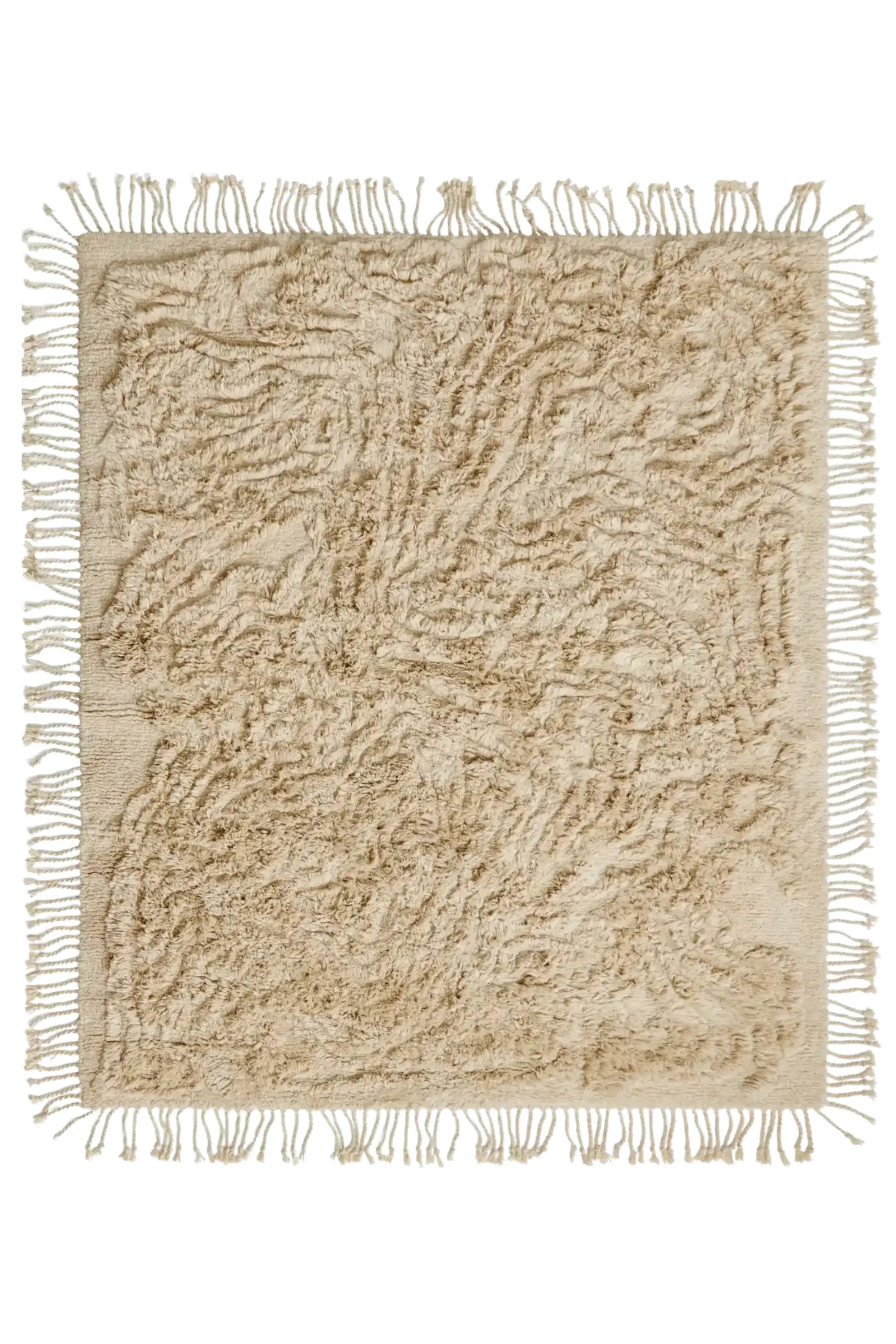 Rug No. 13 brings artistic depth and handcrafted elegance to interiors. Featuring hand-cut patterns embedded in a sumptuous shag, this hand-knotted design uses premium New Zealand wool to deliver tactile richness and subtle sculptural appeal. Twisted wool fringes along the edge enhance its expressive look, making it a standout yet refined addition to any living space.