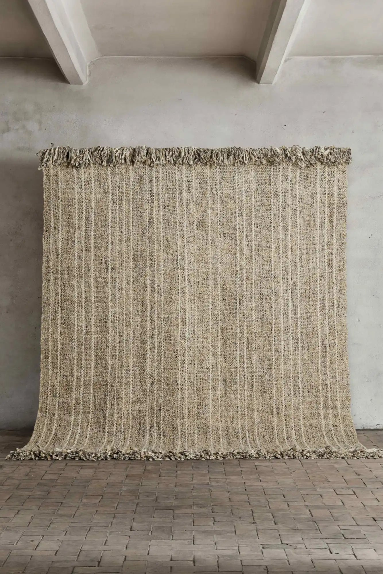 Rug No. 20 quietly elevates interiors with its serene texture and thoughtful composition. Handwoven from 100% premium wool, its mid-beige base is artfully accented by soft, sandy-hued stripes, delivering visual calm and tactile depth. The short fringe, organically integrated from the warp threads, introduces delicate detail and a subtle sense of movement.