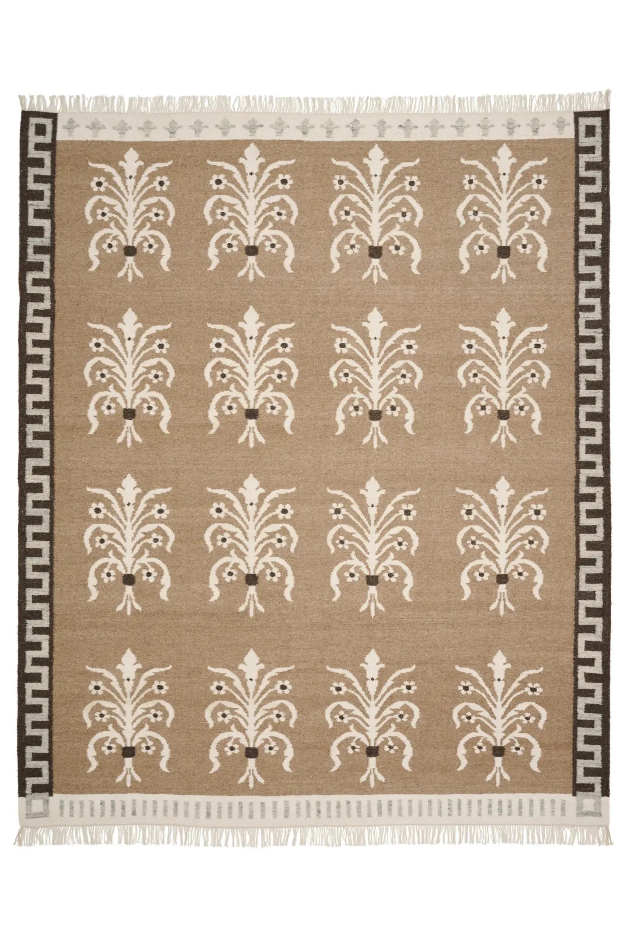 Rug No. 24 brings serene sophistication and timeless elegance through its thoughtful craftsmanship. Handwoven from a blend of wool and linen, the rug features a soft sand‑brown palette enlivened with lighter floral‑inspired motifs—designed to echo the gracious architectural details found in Copenhagen’s Frederiksberg district. The result is a subtle interplay of texture and tranquility, perfect for grounding a serene, curated space.
